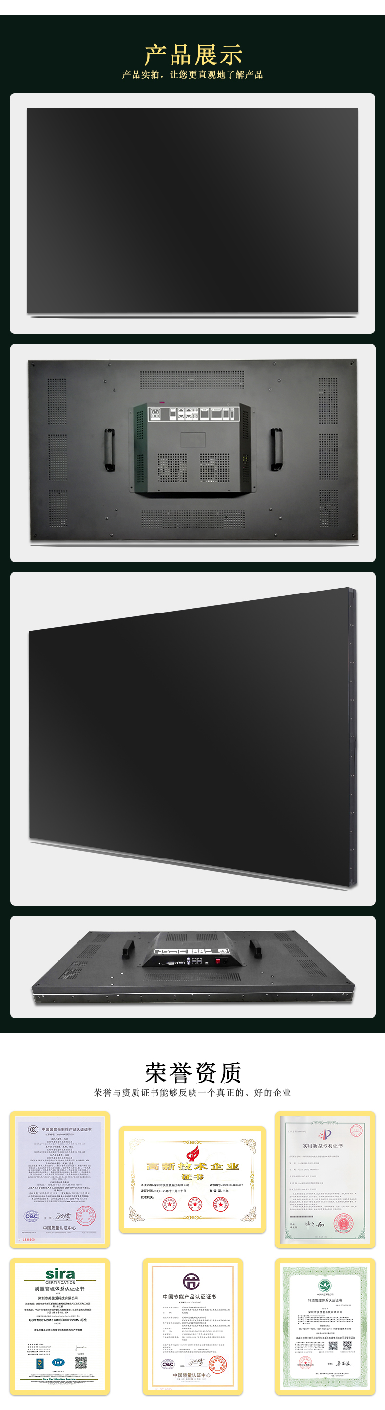 【美佳愛-4k液晶拼接屏生產廠家電話400-997-9971】原裝LG55寸液晶拼接屏3.5mm產品通過ISO9001_3C_節能認證等30多項認證,主營LG/京東方/三星大屏幕電視墻,其尺寸有32寸40寸43寸46寸49寸55寸65寸75寸液晶拼接單元,也有曲面,弧形,柔性,無縫LED顯示屏,顯示器,超窄邊高清監視器,提供企業展廳展示,KTV,酒吧,會議室,視頻監控系統解決方案設計-報價-安裝施工-售后超窄邊維修等服務