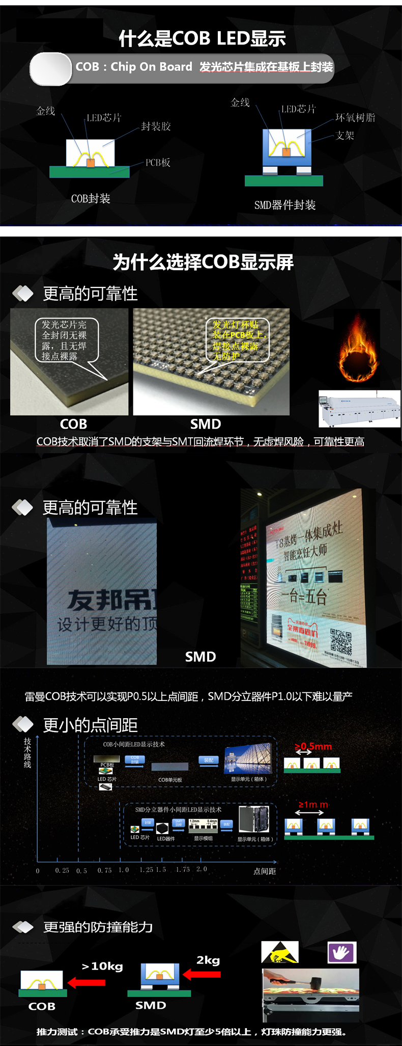 The accomplished COB ultra-fine pitch smart LED display products with less physical stitching, more extreme smooth display, greener and safer applications, stronger protection performance and environmental adaptability. Widely telemedicine, command and control room, radio and television broadcasting, educational conferences, sports media, electronic games and other indoor display applica tion | |