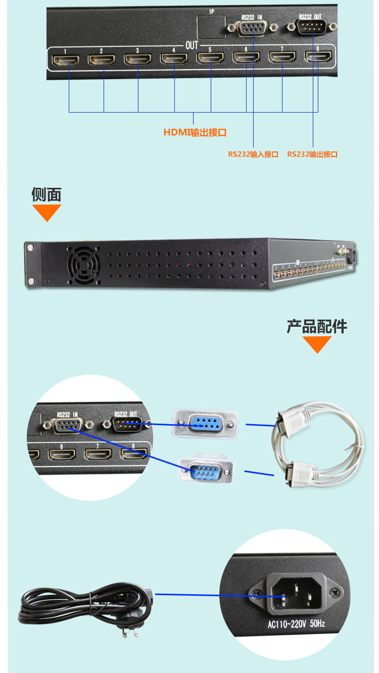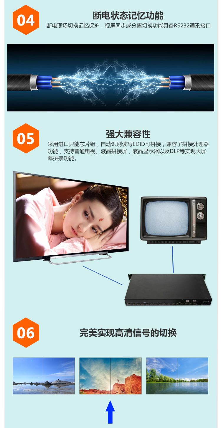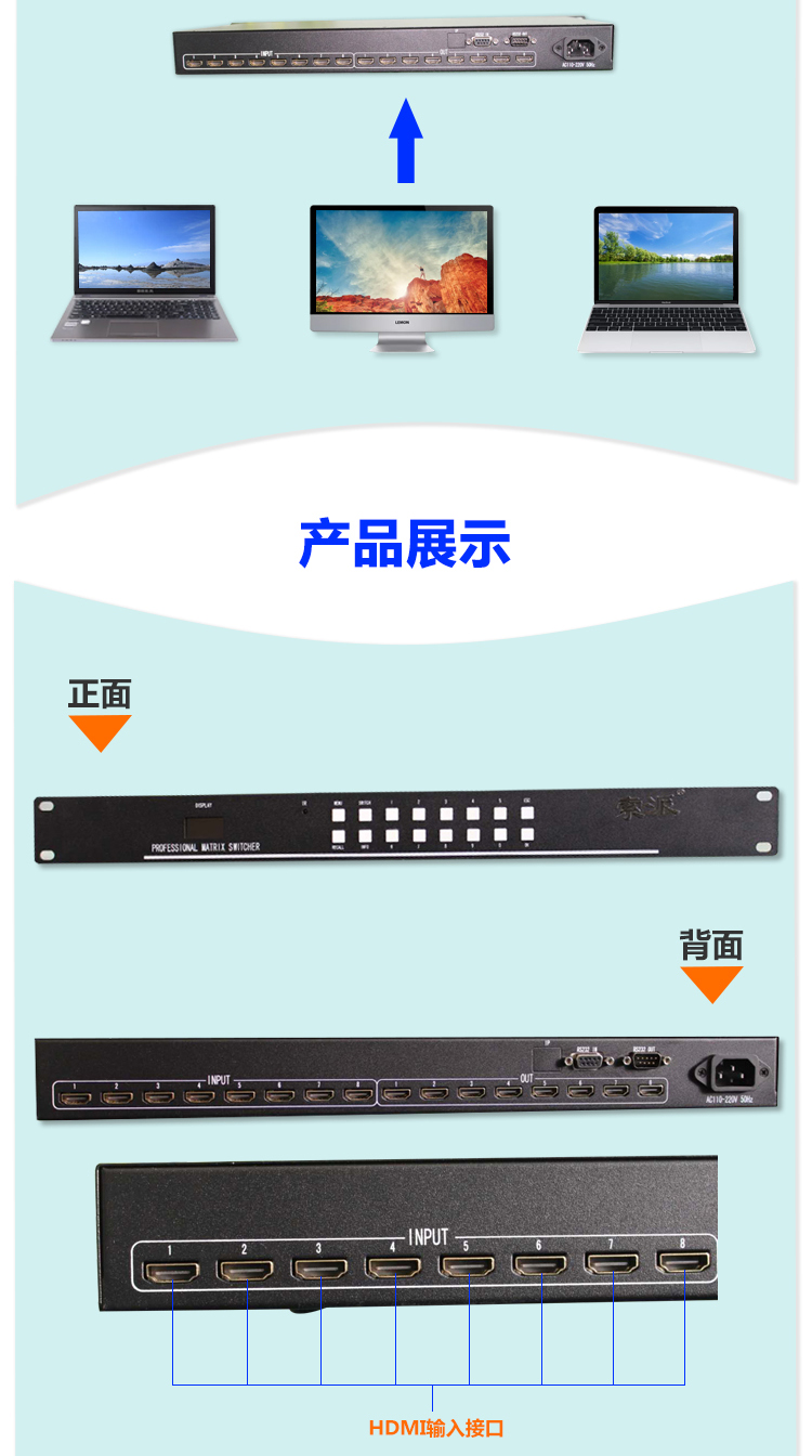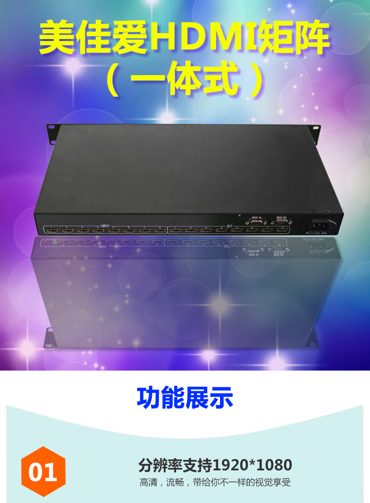 -HDMI高清全數字矩陣切換器, 所有端口支持藍光DVD(支持HDCP);輸入輸出自動均衡,輸入加輸出傳輸距離大于40米(不需配帶芯片的HDMI線);鋁拉絲面板,帶藍光液晶顯示屏顯示操作狀態(tài);帶串口控制,可選配網口;所有輸入端口支持現(xiàn)場寫EDID,所有輸出端口可讀回EDID。