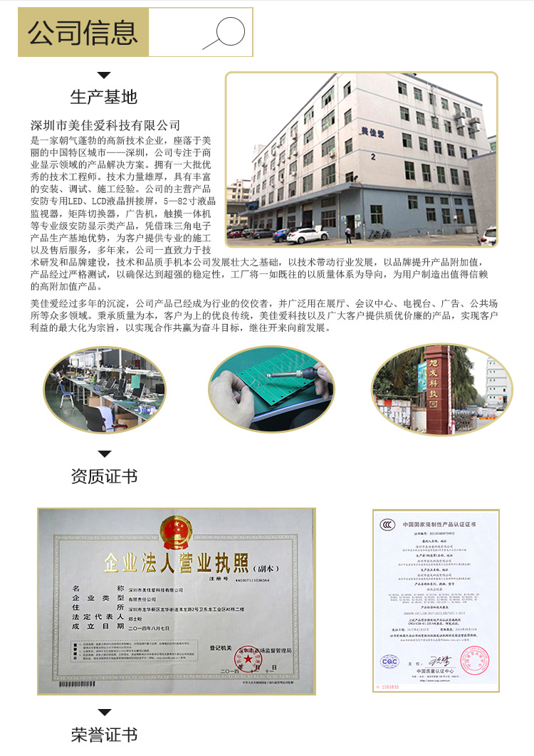 【深圳市美佳愛-液晶廣告機,觸摸一體機生產廠家電話400-997-9971】紅外/電容壁掛觸摸屏電視電腦一體機產品通過ISO9001_3C認證,主營多點紅外/電容式觸摸屏一體機,觸控查詢一體機,其他尺寸18.5寸21寸24寸27寸32寸40寸43寸46寸49寸55寸65寸75寸86寸98寸100寸多功能多媒體教學會議一體機,戶外立式/壁掛雙面廣告機,單機版/安卓網絡廣告機 豎屏樓宇電梯廣告機,長條型屏,工業級工控電腦觸摸顯示器,大尺寸觸摸屏查詢系統,商顯平板電腦電視,提供報價價格,安裝施工,售后維修等