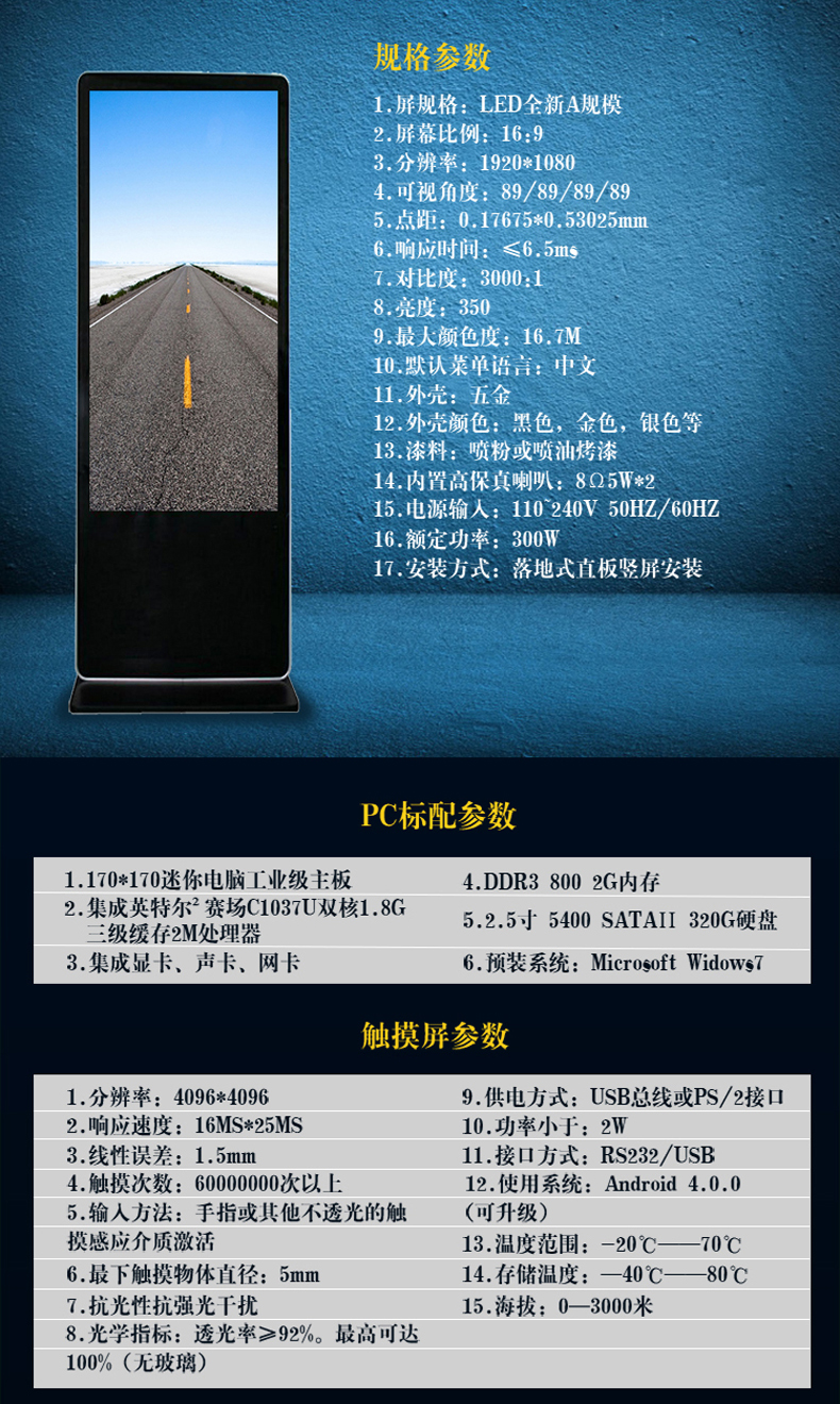 【深圳市美佳愛-液晶廣告機,觸摸一體機生產(chǎn)廠家電話400-997-9971】立式單機/網(wǎng)絡廣告機產(chǎn)品通過ISO9001_3C認證,主營多點紅外/電容式觸摸屏一體機,觸控查詢一體機,其他尺寸18.5寸21寸24寸27寸32寸40寸43寸46寸49寸55寸65寸75寸86寸98寸100寸多功能多媒體教學會議一體機,戶外立式/壁掛雙面廣告機,單機版/安卓網(wǎng)絡廣告機 豎屏樓宇電梯廣告機,長條型屏,工業(yè)級工控電腦觸摸顯示器,大尺寸觸摸屏查詢系統(tǒng),商顯平板電腦電視,提供報價價格,安裝施工,售后維修等