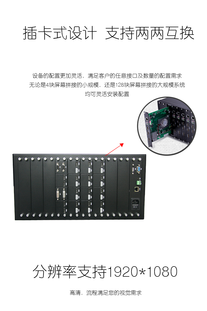 輸入板、輸出板、切換板、風(fēng)扇、電源、防塵網(wǎng)等主要模塊均為插卡式設(shè)計(jì),為日常使用及維護(hù)帶來了極大的方便。