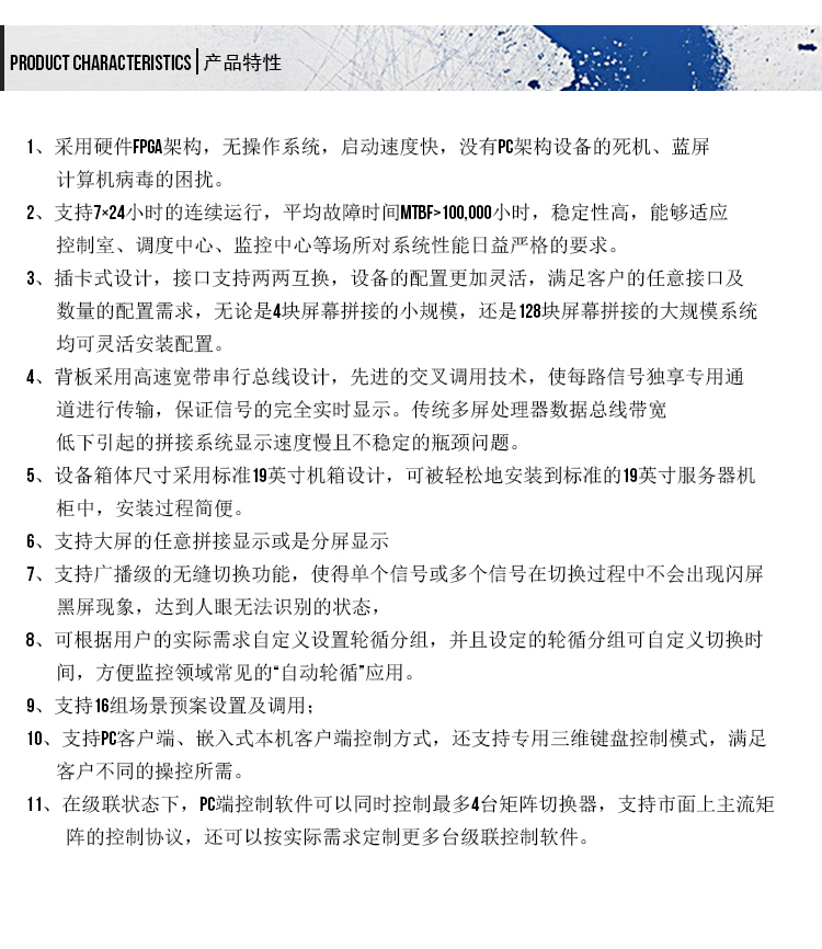 - 支持無縫切換,處理器內(nèi)部集成高清信號(hào)處理機(jī)制,保證信號(hào)切換時(shí)無延時(shí)、無藍(lán)屏、無黑屏等中間過渡狀態(tài)。